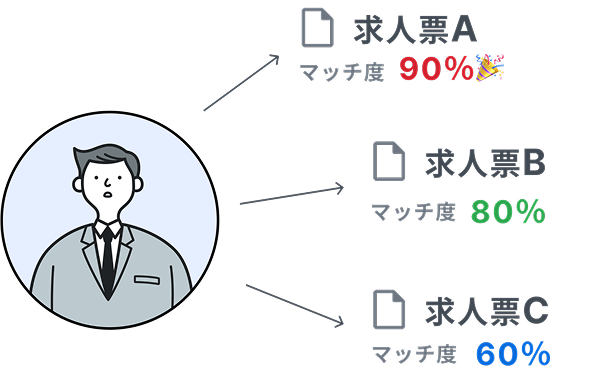 サービスにご登録いただいた自社の求人票と候補者の職務経歴書を突き合わせてマッチ度合いをAIで判定します。候補者にあった募集求人をAIで見極め、最適な選考プロセスをご提案します。