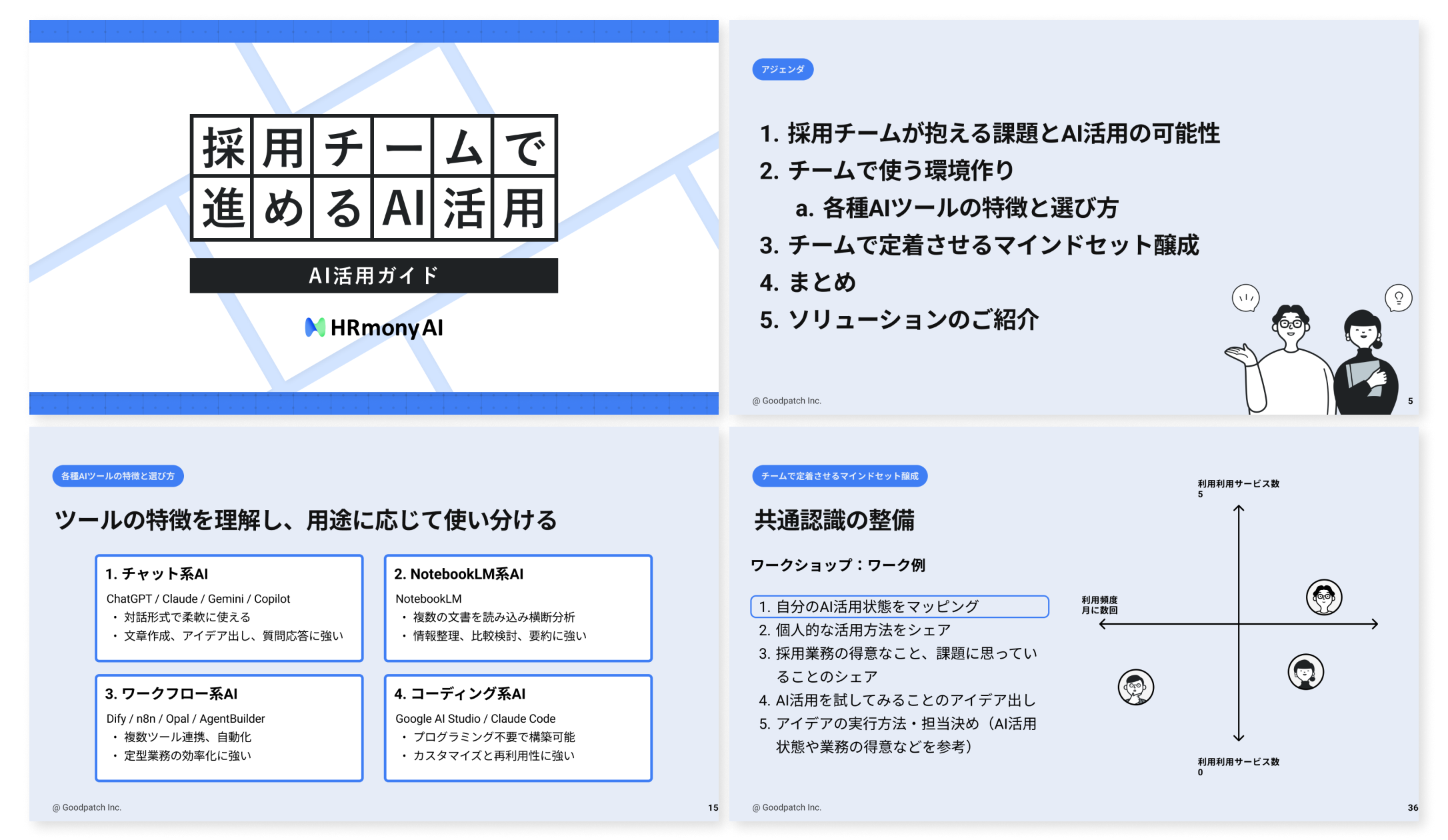 本資料では、採用チームが抱える課題を起点に、ChatGPTやGemini、NotebookLM、Difyなどの主要AIツールをどのように組み合わせ、チーム全体でナレッジを共有・標準化していくかを実践的に解説しています。