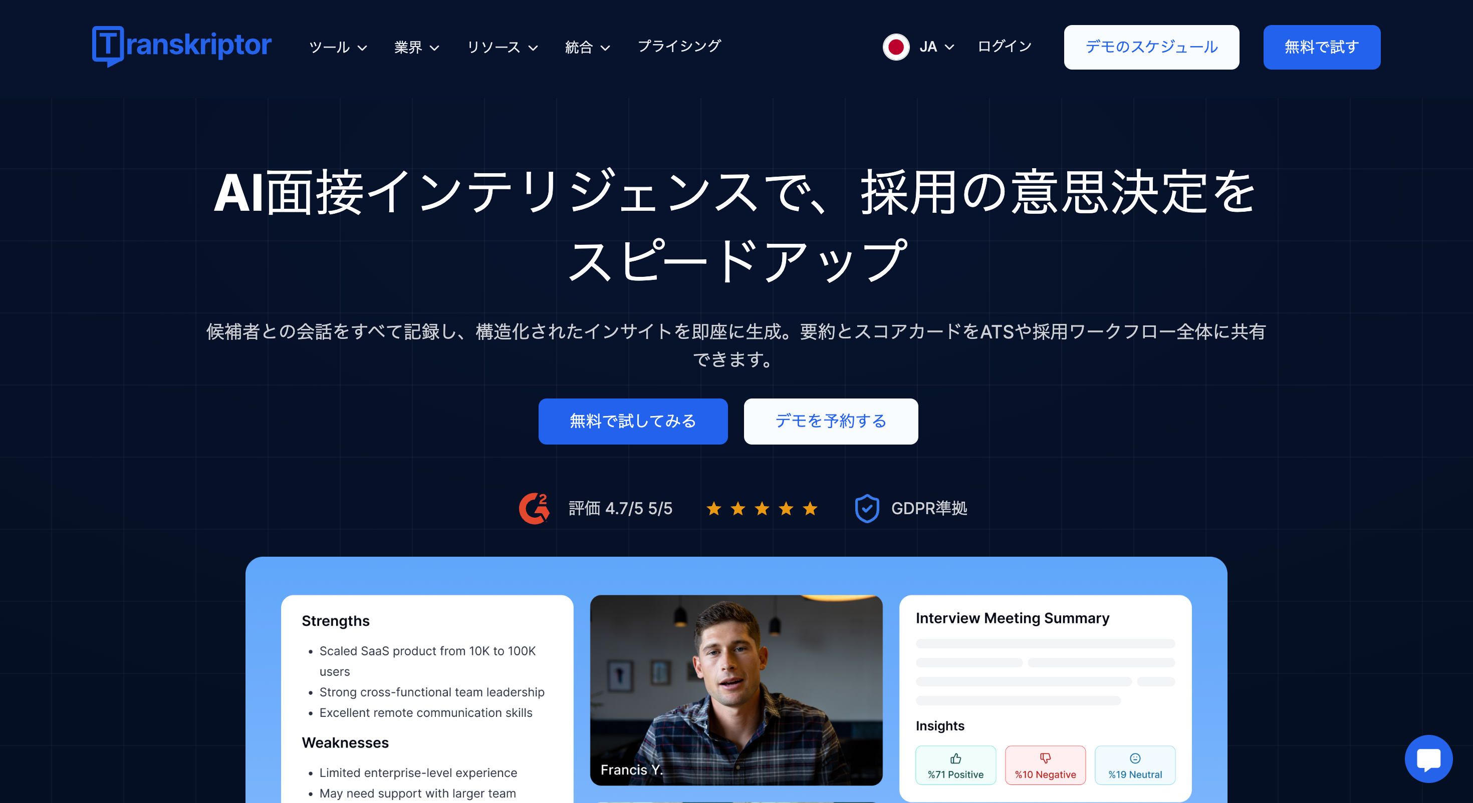 主な機能:面接録画・文字起こし・AIサマリー生成・リアルタイムガイダンス・面接官コーチング・ATS連携