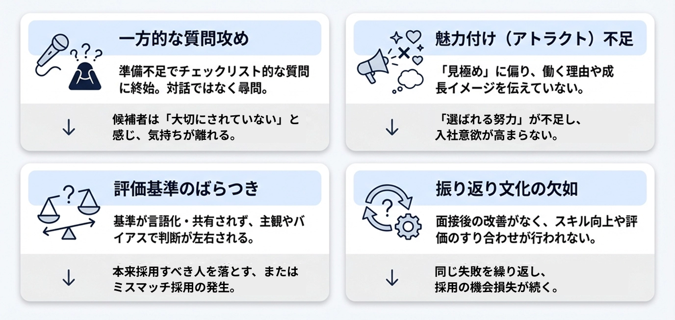では、内定承諾率を下げている面接官の問題とは、具体的にどんなものでしょうか。採用現場でよく見られるパターンを4つ整理しました。心当たりのあるものはないか、確認してみてください。