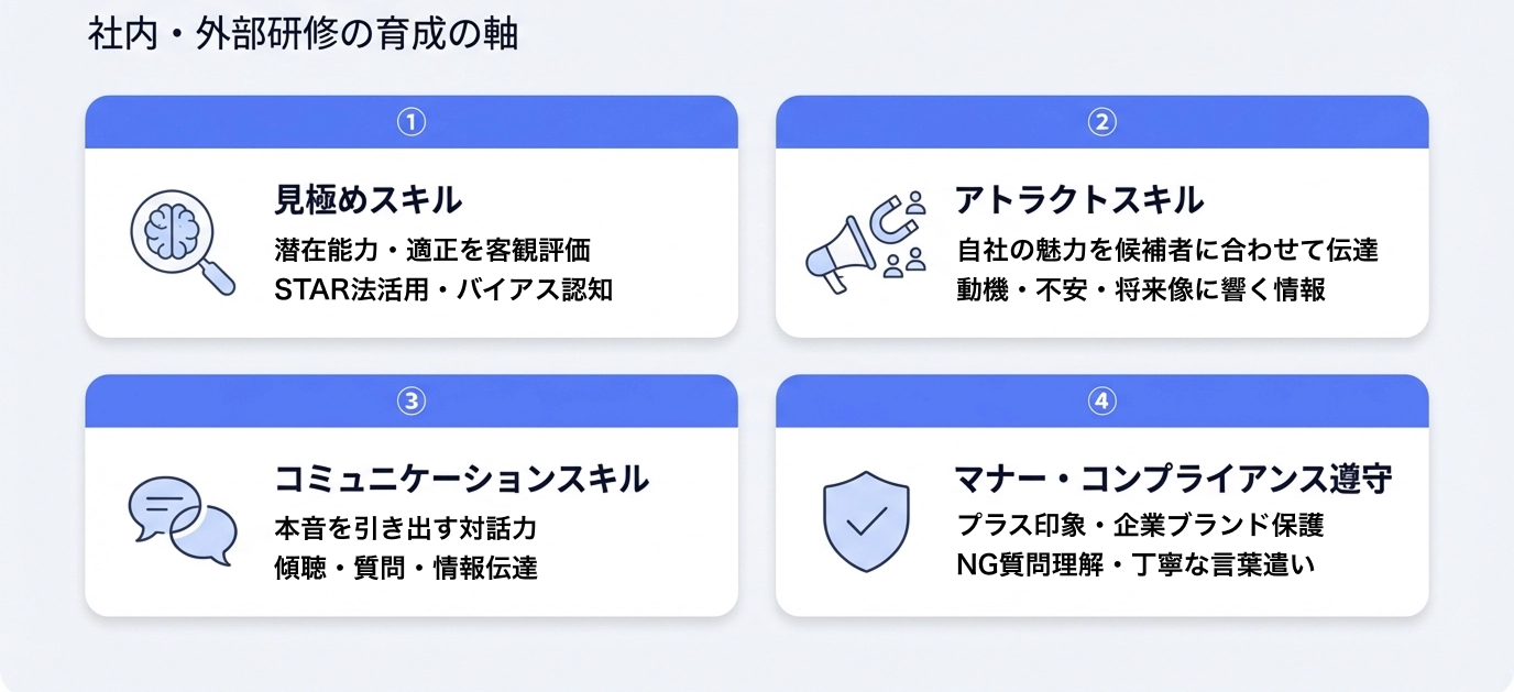 まず、面接官に必要なスキルを整理しておきましょう。社内・外部研修どちらに取り組む場合も、この4つが育成の軸になります。