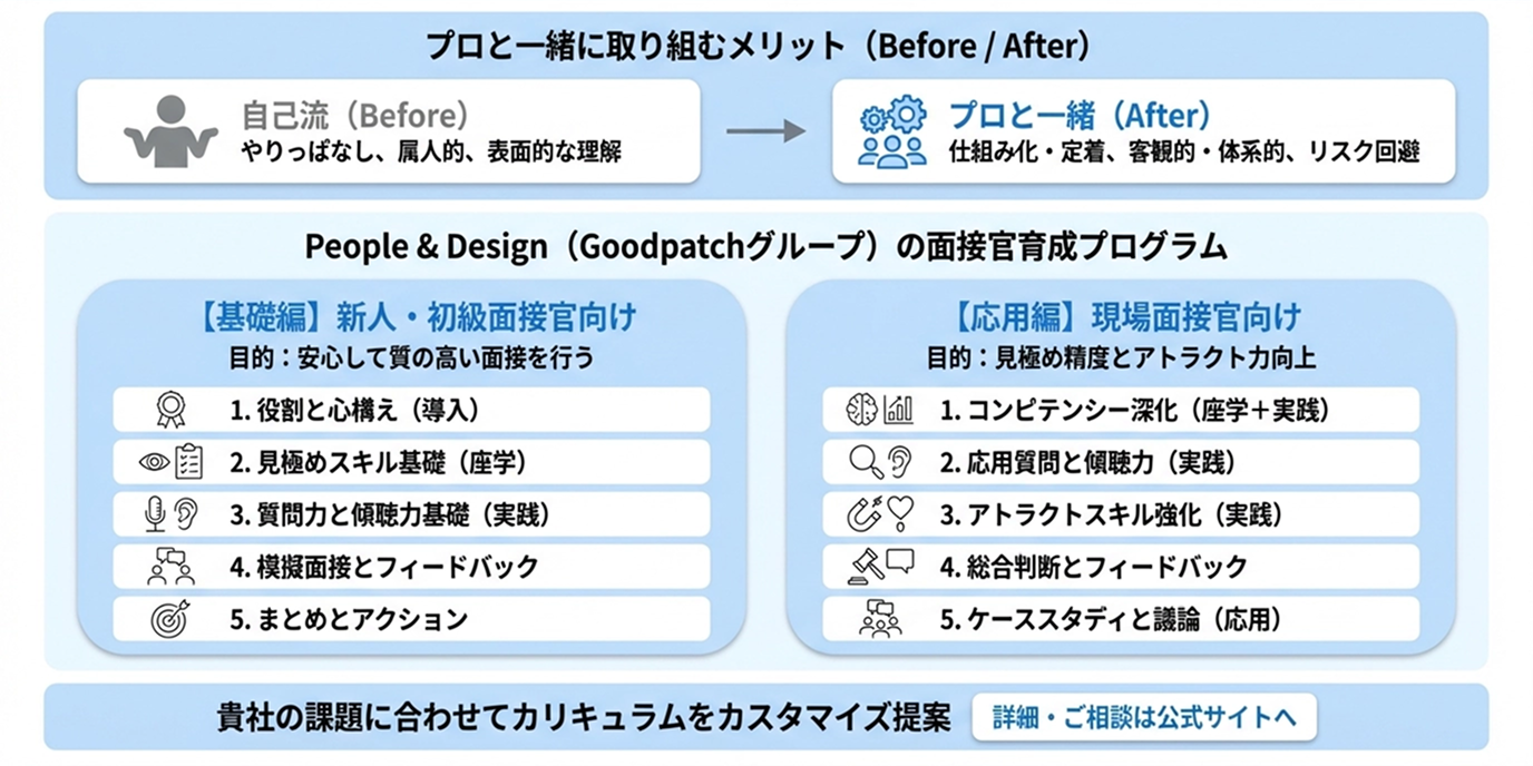 グッドパッチのグループ会社である株式会社ピープルアンドデザイン(People & Design)は、採用力・ブランド力の向上を専門とする組織デザイン会社です。面接官育成に特化した体系的なトレーニングプログラムを提供しています。