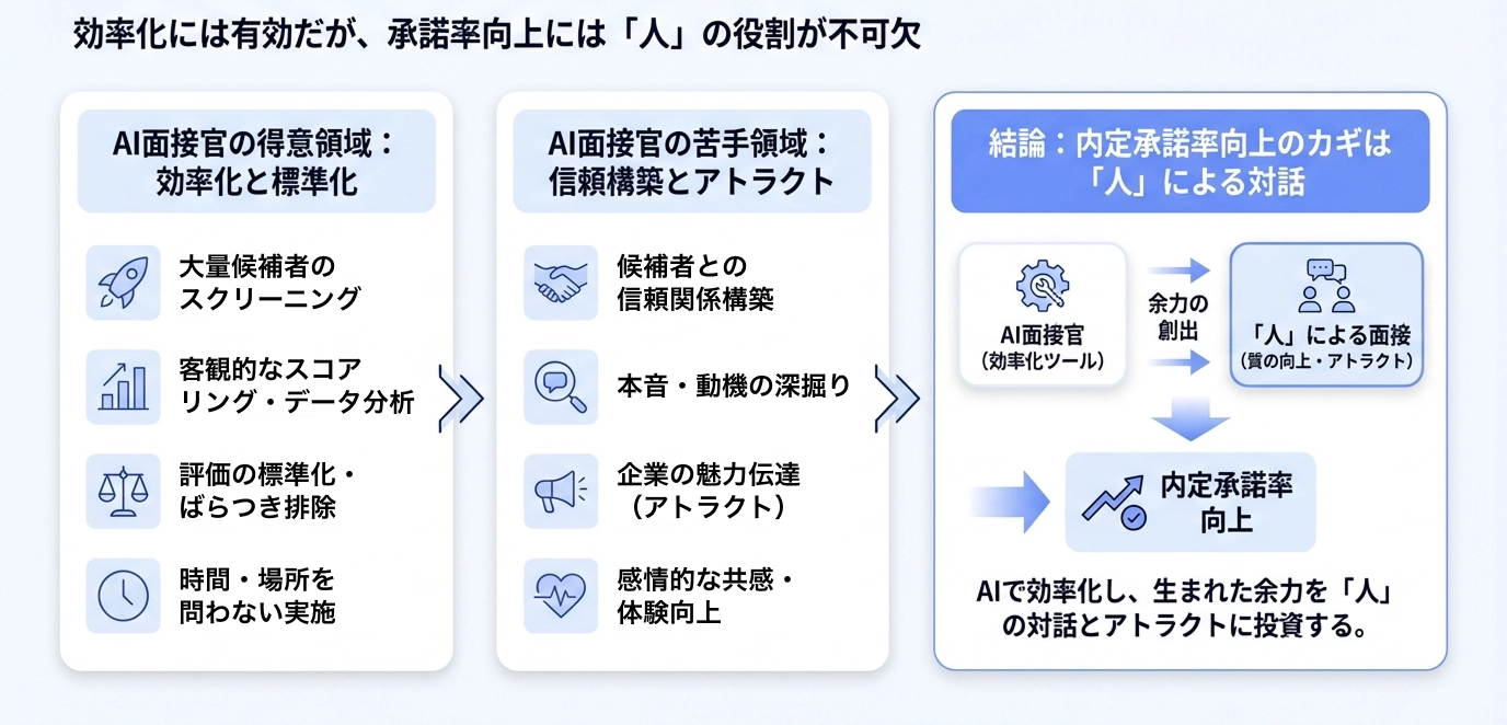 候補者がオファーを受け入れるかどうかは、面接を通じて「自分のことを真剣に見てくれている」「自分の将来を一緒に考えてくれている」という体験に大きく左右されます。AI面接官だけで選考を完結させると、候補者は「まだ会社の人間と話していない」という欠乏感を持ったまま内定を受け取ることになります。