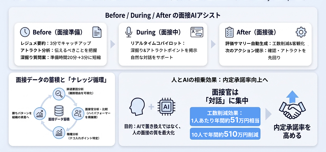 面接官がレジュメ確認や評価記入に費やしていた時間(1回あたり計34分)をAIが代替し、その分だけ面接官は「候補者との対話」に集中できます。面接官の工数削減は1人あたり年間51万円相当。10人の面接官がいれば、年間510万円の削減効果を生み出します。