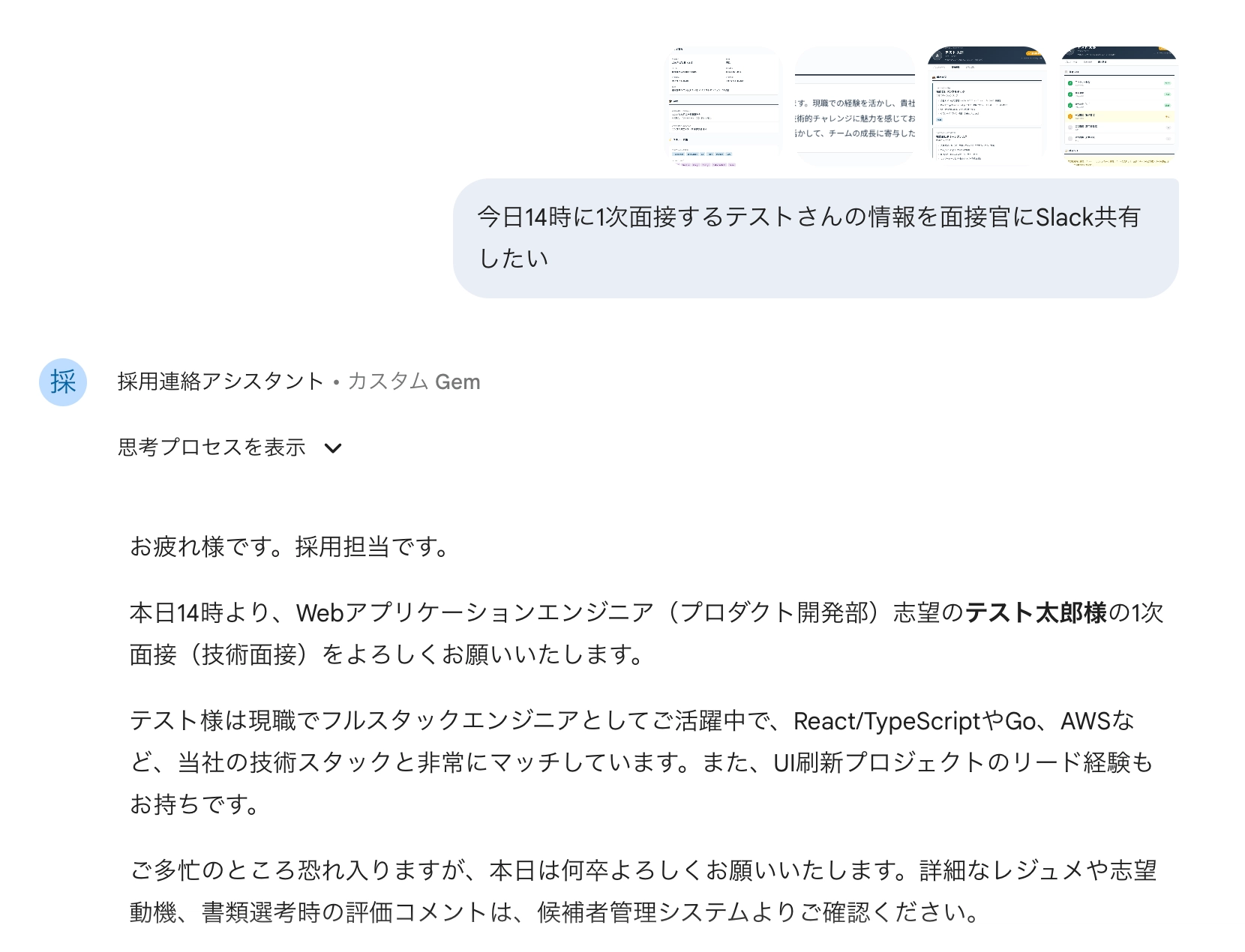 面接官へのSlack共有:「今日14時に1次面接するAさんの情報を面接官にSlack共有したい」と伝えて候補者情報を貼ると、確認ポイント・強み・懸念事項がまとまった共有文が出てきます。GPTs・Gemsは自社の訴求ポイントやよく使うフレーズをすでに知っているので、出力の質が安定します。