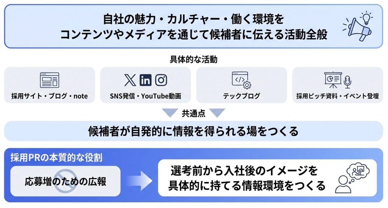 採用PRとは、自社の魅力・カルチャー・働く環境をコンテンツやメディアを通じて候補者に伝える活動全般を指します。
